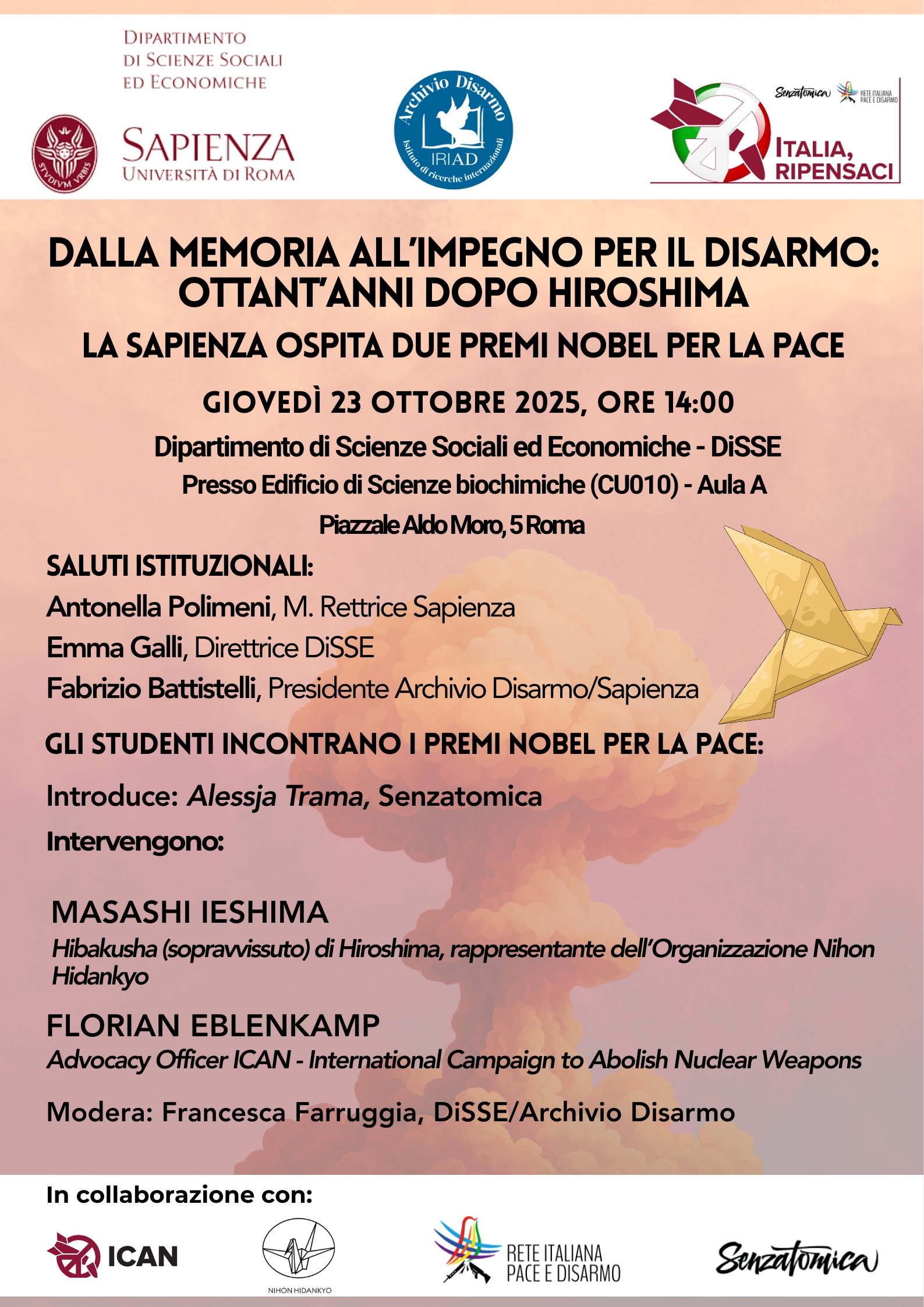 - Nel pomeriggio dello stesso giorno, l’incontro presso l’Università “La Sapienza” di Roma, “Dalla memoria all’impegno per il disarmo – Ottant’anni dopo Hiroshima” (sopra la locandina dell'evento)
