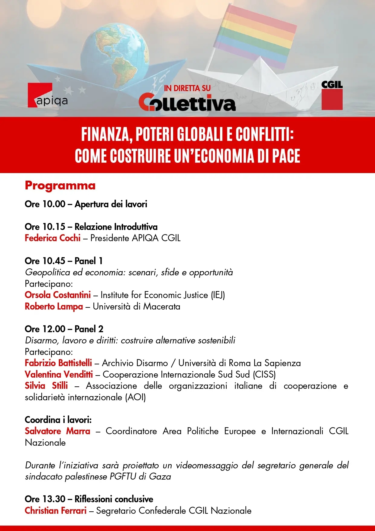 Martedì 7 ottobre dalla Sala Santi della CGIL Nazionale (Roma, Corso d'Italia, 25) si è tenuta la tavola rotonda "Finanza, poteri globali e conflitti: come costruire un'economia di pace". L'evento è stato un'occasione per approfondire le dinamiche tra economia, politica e sicurezza internazionale. Durante il Panel 2 è intervenuto Fabrizio Battistelli, presidente di Archivio Disarmo, offrendo un’analisi sulle connessioni tra industria bellica e interessi economici.