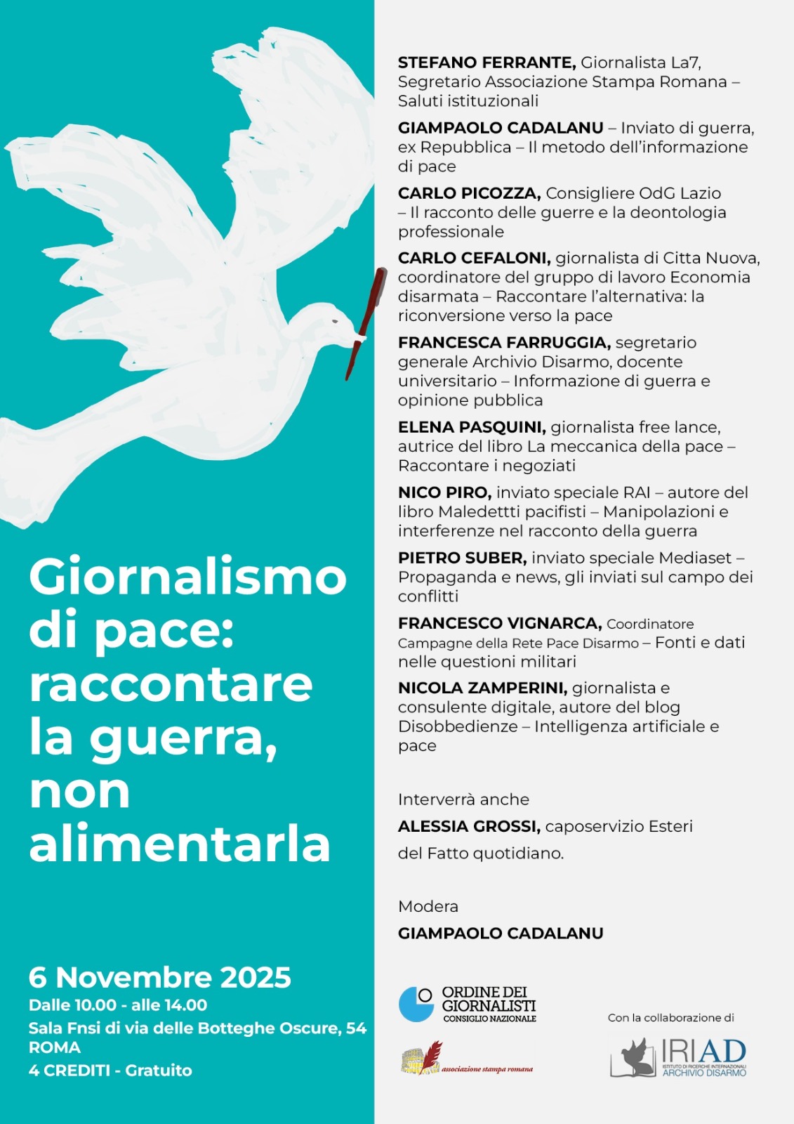 Giovedì 6 novembre 2025 dalle ore 10:00 alle 14:00 presso la Federazione Nazionale Stampa Italiana - FNSI (Via delle Botteghe Oscure, 54) si terrà il seminario "Giornalismo di pace: raccontare la guerra, non alimentarla". Durante l'incontro interverrà Francesca Farruggia, Segretaria Generale di Archivio Disarmo e docente presso Università di Roma La Sapienza.