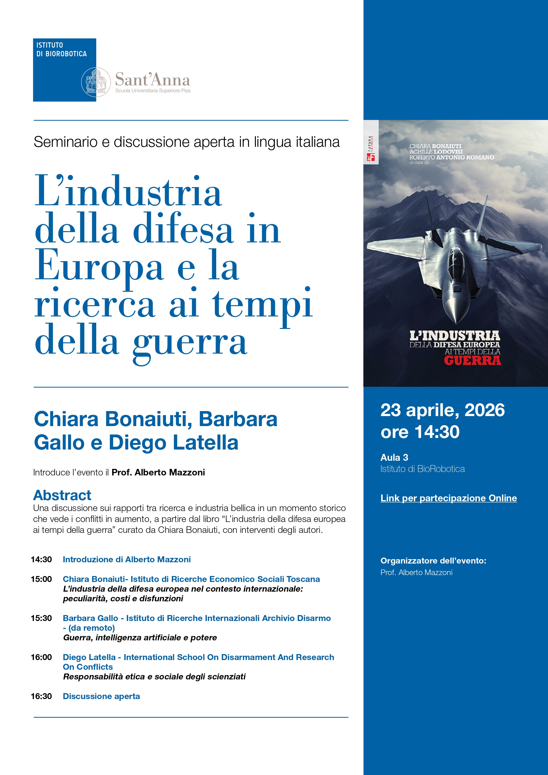 Giovedì 23 aprile si terrà presso l'Università Sant'Anna di Pisa e online il seminario L'industria della difesa in Europa e la ricerca ai tempi della guerra. Una discussione sui rapporti tra ricerca e industria bellica in un momento storico che vede i conflitti in aumento, a partire dal libro "L'industria della difesa europea ai tempi della guerra" curato da Chiara Bonaiuti, con interventi degli autori.
