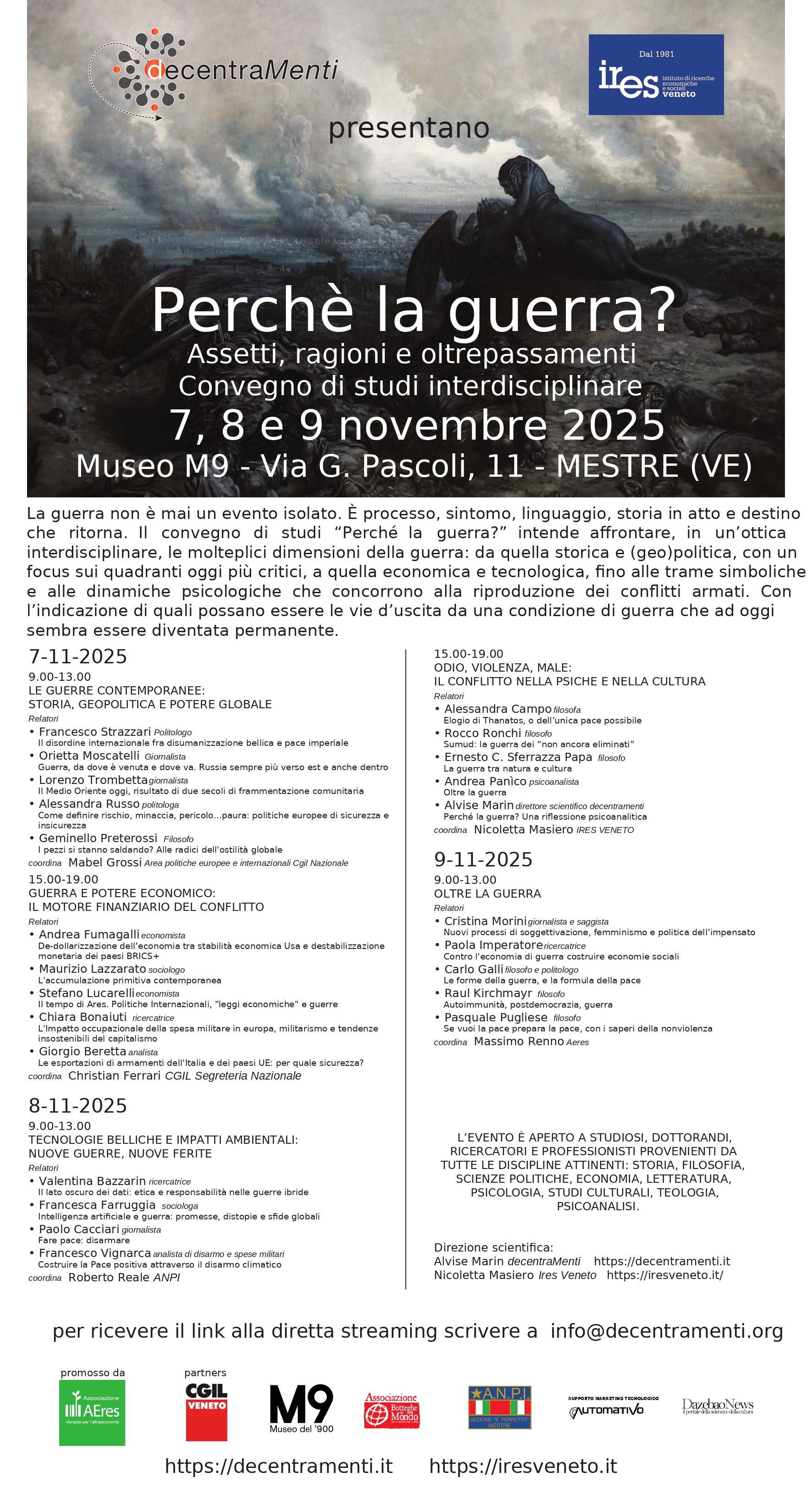 Dal 7 al 9 novembre il Museo M9 di Mestre (Venezia) ospiterà il convegno di studi interdisciplinare “Perché la guerra? Assetti, ragioni e oltrepassamenti”, promosso da DecentraMenti e Ires Veneto. Tre giornate di approfondimento per indagare le molteplici dimensioni della guerra e le prospettive di una pace possibile.