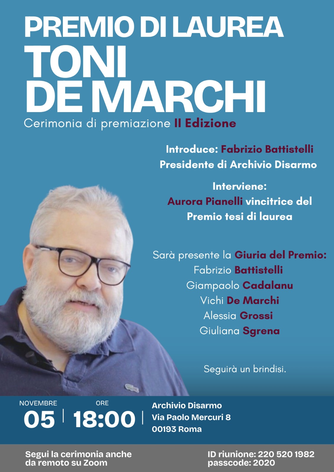 Mercoledì 5 novembre alle 18:00 si terrà presso la sede di Archivio Disarmo la cerimonia di premiazione. Puoi seguire l’evento anche su Zoom cliccando qui.