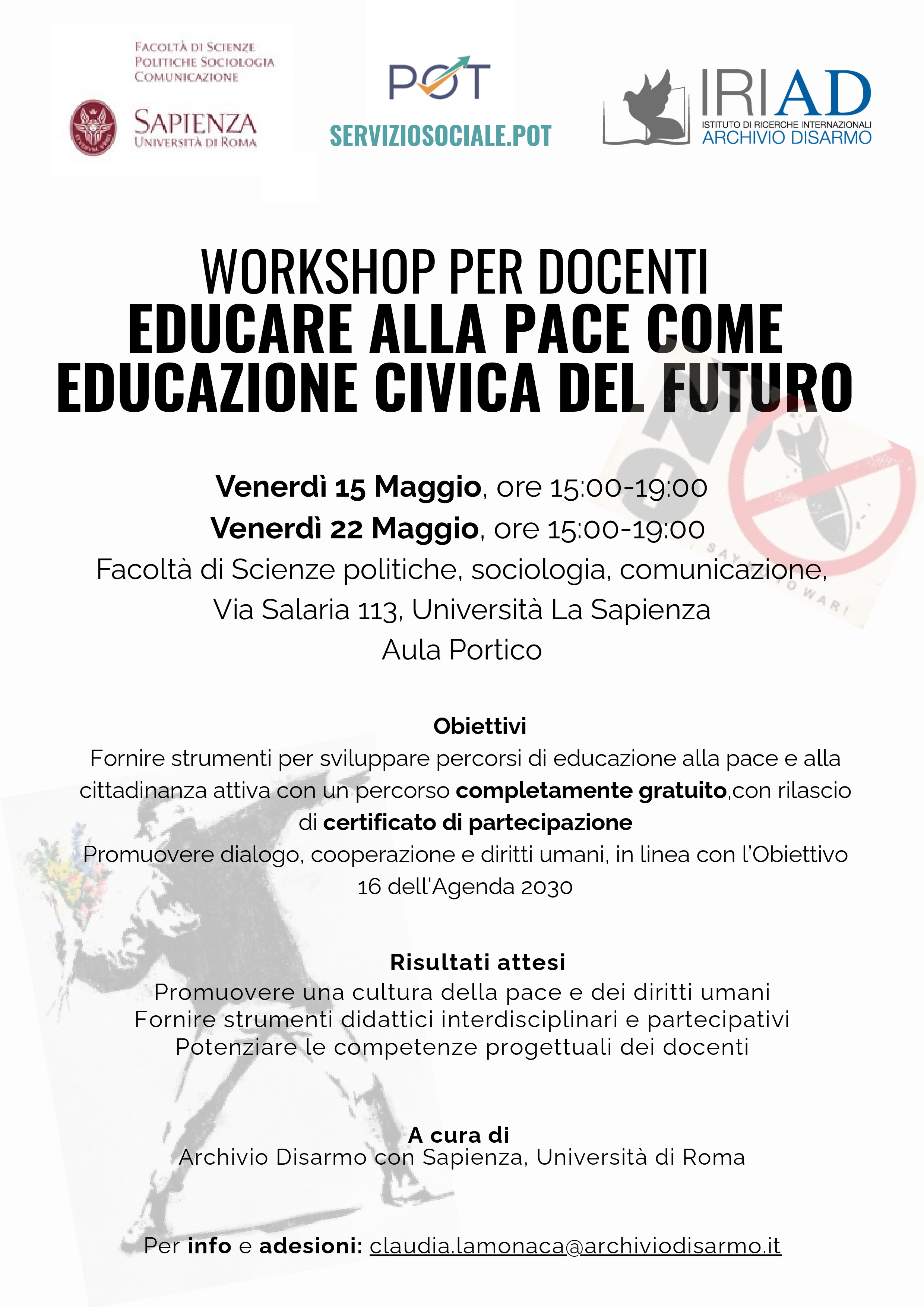 Venerdì 15 e 22 maggio si terrà il workshop rivolto ai docenti Educare alla pace come educazione civica del futuro presso l'Università La Sapienza. L'obiettivo è fornire gli strumenti necessari per sviluppare percorsi di educazione alla pace. Un workshop gratuito per docenti per trasformare l’educazione civica in uno spazio di dialogo, cooperazione e diritti umani. Realizzato da Archivio Disarmo in collaborazione con Sapienza, Università di Roma.