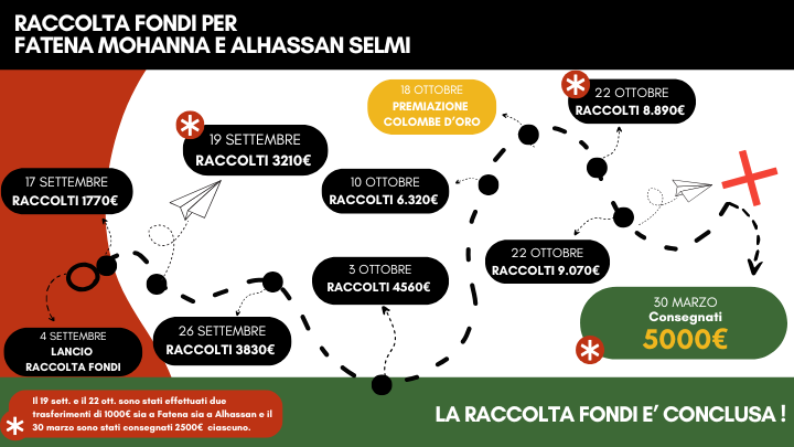 Denaro inviato/consegnato Data Importo 19 settembre (inviato) 2000€ (1000€ ciascuno) 22 ottobre (inviato) 2000€ (1000€ ciascuno) 30 marzo (consegnato) 5000€ (2500€ ciascuno) TOT. 9000€ (4500€ ciascuno) Spesa trasferimento fondi 128€ Denaro raccolto Data Importo 17 settembre 1770€ 19 settembre 3210€ 26 settembre 3830€ 3 ottobre 4560€ 10 ottobre 6320€ 22 ottobre 8890€ 28 ottobre 9070€